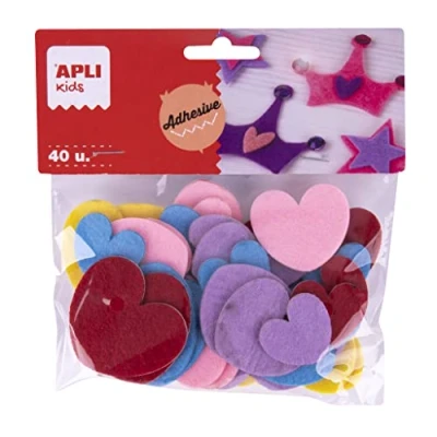 Felt adhesive hearts in assorted sizes and colours. Contains 40 hearts measuring 30 mm (10 u). ), 40 mm (15 u.) and 50 mm (15 U.) in different colours: red, lilac, blue, pink and yellow. Highest quality: highly resistant and soft felt. Ideal for all types of crafts and decorations: headbands, children's bags, invitations, handkerchiefs, albums, gloves, robes, scrapbooking work, agendas.., Manufacturer: APLI