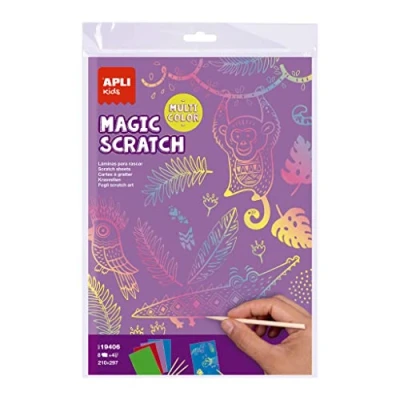 BLOCK OF COLORED SHEETS FOR SCRAPING. Each pad contains 8 sheets and a wooden scraper stick. USE: Easy and fun game: just scratch the drawings of the sheets with the wooden pencil and discover the hidden colors below. Each illustration includes an image with a sample design, but the child can draw by marking different lines and motifs. Ideal to take you on a trip. High didactic value play: promotes creativity and helps reinforce confidence and self-esteem, helps improve accuracy, manual skill and concentration. Recommended for children from 4 years old., Manufacturer: APLI