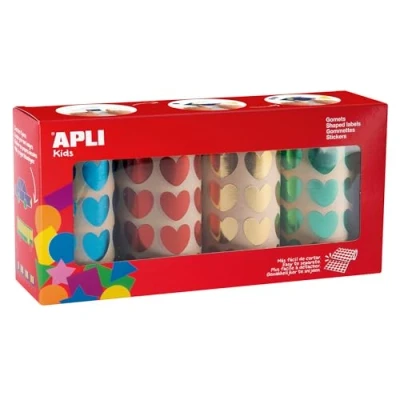 Set of 4 rolls of heart shaped stickers in metallic colours blue, green, yellow and red - permanent adhesive. Package: Each box contains 4 rolls, each roll consists of 47 pre-cut sheets. The box contains a total of 5640 stickers, 1410 stickers per color. Format: The roll format is ideal for use in schools, daycare centers and workshops with children in groups. Use: Playing with stickers is a fun activity that promotes the development of fine motor skills. It also helps to learn colors, shapes and sizes, while stimulating creativity and logic. In addition, it encourages teamwork and improves spatial coordination. These HEART stickers can be used for crafts and crafts. Quality: APLI stickers meet the highest quality and safety standards., Manufacturer: APLI