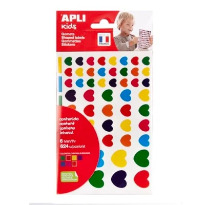 Heart shaped stickers in a variety of sizes and colours: yellow, blue, red, green, pink, orange, lilac. Available in three different sizes with repositionable adhesive. Contents: Each pack contains 6 sheets, a total of 624 stickers (104 stickers per sheet). Ideal size for use in schools, nurseries, children's workshops or any other group working with children. Also ideal for decorating your favourite items, greeting cards, gift wrapping, etc. USE: Playing and creating with stickers is an essential activity promoting the development of fine motor skills, while soliciting various abilities and skills such as recognition of colors, geometric shapes and sizes. It also stimulates the development of logic and creativity. Quality: APLI stickers meet the highest quality and safety standards. Stickers made in France.
