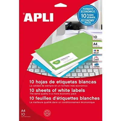 Universal Labels APLI 210x148mm, rectangle, white, 100 sheets 10 sheets of A4 multi-purpose FSC certified paper. Apli-Agipa labels for inkjet printers, laser printers and copiers on the market: Epson, Canon, HP, Lexmark..... No risk of jamming due to high temperature adhesive