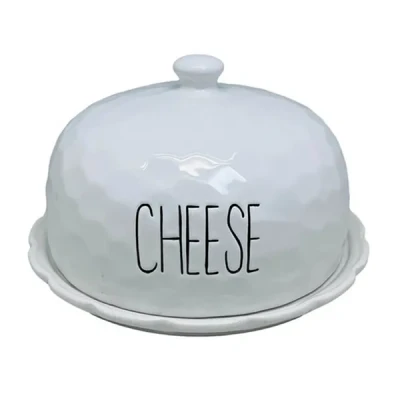 General description The Apollo Dimples Cheese Dome is a stylish and functional piece made from ceramic, featuring a white glaze finish. The exterior showcases a unique dimple effect, and the word 'cheese' is elegantly debossed in black on the lid. This cheese dome includes a matching lid with a handle, making it perfect for keeping your cheese selection fresh and dry. It is part of a collection, with other items sold separately.