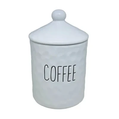 General description The Apollo Dimples Coffee Canister is a stylish and functional storage solution for coffee lovers. Made from ceramic and finished in a sleek white glaze, it features a unique dimple effect on the exterior. The word 'coffee' is elegantly debossed in black on the front, adding a touch of sophistication. This canister comes with a matching lid, making it perfect for storing beans, granules, or freshly ground coffee. It is part of a collection, with other items sold separately.
