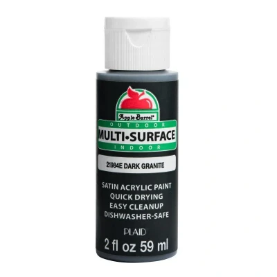Dark Granite Apple Barrel Multi-Surface Acrylic Paint makes your projects even more fun and easier. It bears the same great characteristics as original Apple Barrel paint quality, selection, and value with the added benefit of multi-surface coverage! This water-based, certified non-toxic craft paint is great for tin, terracotta, paper mache, canvas, wood, plaster, rigid plastic, fabric, concrete, glass, and ceramics and it cleans up easily with soap and water! Size: 2 oz. More Info: 2 oz. provides up to 4 square feet of coverage, 2 coats PE21984E MPN 21984E