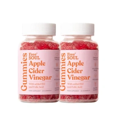 𝗨𝗡𝗙𝗜𝗟𝗧𝗘𝗥𝗘𝗗 & 𝗦𝗧𝗥𝗢𝗡𝗚 – Each Free Soul ACV gummy contains 500mg of raw unfiltered apple cider vinegar, the equivalent of 2 teaspoons (10ml). Suitable for both Vegans and Vegetarians, enjoy 2 delicious gluten-free gummies per day. 𝗘𝗡𝗛𝗔𝗡𝗖𝗘𝗗 𝗕𝗘𝗡𝗘𝗙𝗜𝗧𝗦 – Free Soul's apple cider vinegar has been reinforced with Vitamin B12, B6, Folic Acid, Pomegranate Powder, and Beetroot Powder. This contributes to the normal function of the immune system, supports normal hair, skin & nails, and the reduction of tiredness & fatigue. 𝗚𝗥𝗘𝗔𝗧 𝗧𝗔𝗦𝗧𝗘 – Enjoy the benefits of ACV, without the unpleasant bitter taste! Designed to look and taste like candy, Free Soul gummies are delicious. Just 2 gummies per day give you all the benefits of drinking 2 teaspoons of apple cider vinegar liquid. 𝗜𝗡𝗗𝗨𝗦𝗧𝗥𝗬 𝗟𝗘𝗔𝗗𝗜𝗡𝗚 𝗤𝗨𝗔𝗟𝗜𝗧𝗬 – Natural ingredients that are free from gluten, soy, gelatin, artificial sweeteners, colours & preservatives - Free Soul gummies are more effectively absorbed so you can enjoy all the benefits of our high strength apple cider vinegar gummies! 𝗡𝗨𝗧𝗥𝗜𝗧𝗜𝗢𝗡𝗜𝗦𝗧 𝗙𝗢𝗥𝗠𝗨𝗟𝗔𝗧𝗘𝗗 – Free Soul products have been formulated by one of the UK's leading nutritionists and produced according to the highest manufacturing standards in the world. We source the finest and most beneficial ingredients to allow us to produce advanced nutritional supplements to benefit our customers across the globe! 𝗘𝗮𝗰𝗵 𝗯𝗼𝘁𝘁𝗹𝗲 𝗰𝗼𝗻𝘁𝗮𝗶𝗻𝘀 𝟲𝟬 𝗴𝘂𝗺𝗺𝗶𝗲𝘀 | 𝗢𝗻𝗲 𝗠𝗼𝗻𝘁𝗵 𝗦𝘂𝗽𝗽𝗹𝘆 (𝟯𝟬 𝗦𝗲𝗿𝘃𝗶𝗻𝗴𝘀)