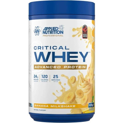 Applied Nutrition Critical Whey Banana 825g is a premium protein supplement blending whey concentrate and isolate to support muscle growth and recovery, delivering 22–24g protein per serving with BCAAs. Fast-digesting and easily mixed, it’s ideal post-workout or between meals, with a smooth banana flavour.