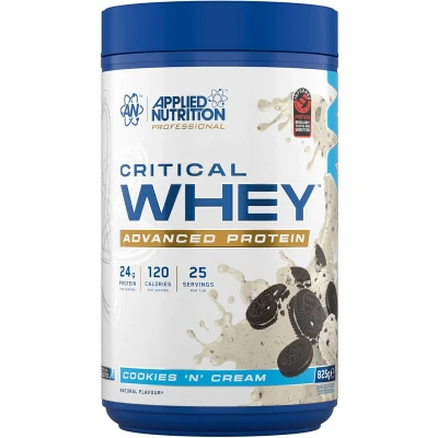 Applied Nutrition Critical Whey Cookies 'N' Cream 825g is a premium blend of whey protein concentrate and isolate, providing 22–24g protein per serving to support muscle growth and recovery. Fast-digesting and easily mixed, it offers a delicious flavour and is ideal for post-workout or daily protein needs.