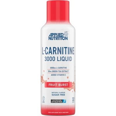 Applied Nutrition L-CARNITINE 3000 Fruit Burst is a vegan-friendly, Halal-certified liquid supplement delivering 3000mg L-Carnitine and 50mg Green Tea Extract per serving to support fat metabolism, energy, and performance, with a refreshing Fruit Burst flavor. Contains zero sugar, fat, or protein and includes added Vitamin C.