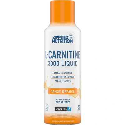 Applied Nutrition L-CARNITINE 3000 Tangy Orange (480ml) is a vegan and Halal certified liquid supplement providing 3000mg L-Carnitine and 50mg Green Tea Extract per serving to support fat metabolism, energy production, and endurance, with a refreshing tangy orange flavor.