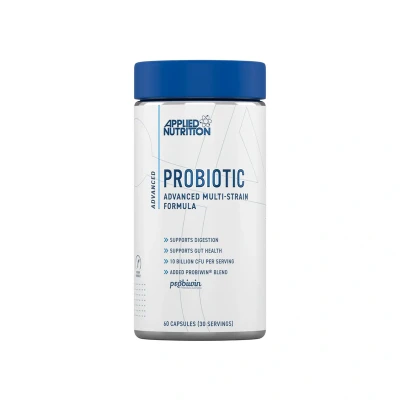 Applied Nutrition Probiotic Advanced Multi-Strain, 10 Billion CFU, Vegan&Halal, 60 Capsules: This advanced probiotic formula provides 10 Billion CFU per serving to support gut, digestion, and immune health, with a vegan and Halal blend of 10 tested live bacterial strains, suitable for diverse dietary needs and athletes.