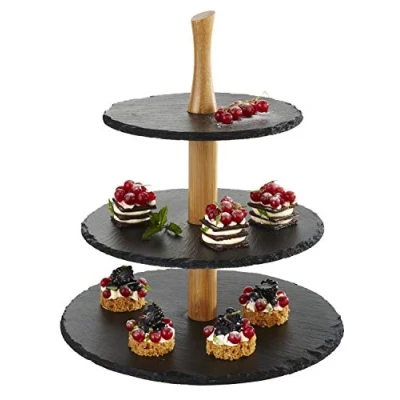 APS Présentoir à 3 étages en ardoise naturelle Ø 30 / 25 20 cm x h 34 cm, env. Épaisseur : 0,6 avec colonne bois Pieds antidérapants qui n’abîment pas les meubles