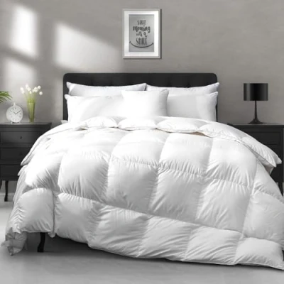 Softly Sensuous: 400 Thread Count double-brushed Cotton Blend Cover. Our hotel-style duvet insert is extra soft, plush, fluffy, and the silk touch provide you a snug night's sleep. Lightweight duvet insert: The King Size duvet insert is 106x90 inches. The thin duvet insert perfect for most people with the warmer weather use, or Hot Sleepers uses as an all-season down feather fibers quilt or people who keep their bedrooms over 64℉ (18℃). Sleep in Cloud: We strictly select responsibly-harvested down fibers and feather fibers fillings that are fluffy and odorless. The premium down fibers and feather fibers content makes a soft and lightweight, but very insulating duvet insert. Made to Last: The duvet insert with baffle box design makes the most of the loft so the fillings remain evenly distributed throughout the duvet. The elegant boxes and double-stitched edge with silver piping look decorative and 8 corner tabs help easily attach duvet cover. Get Fresh: A duvet bag included for storing to keep the duvet insert fluffy and fresh. Recommend tumble for 10 minutes at low temperature at first time use. Spot clean or dry clean if possible. Recommend use it as a duvet insert with a duvet cover.