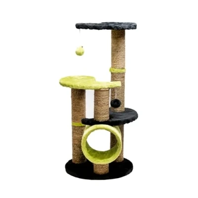 Aqpet Scratching Post 86 cm Sisal Rope with Double Platform and Tunnel for Maximum Fun Your Cat, Black/Green