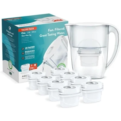 Aqua Optima PJ0611 Oria Water Filter Jug & 9 x 30 Day Evolve+ Cartridge, 2.8 Litre Capacity, for Reduction of Microplastics, Chlorine, Limescale and Impurities, White