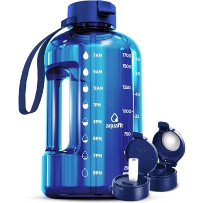 Track how much you drink - Our half gallon water bottles come with clear time markers on the side so you can see your daily water intake and stay on track to meet your health and fitness goals. Large 1/2 gallon, 64 oz water bottle - Our water bottles with times to drink are durable, lightweight and portable. Forget about refills: this motivational water bottle is perfect for an on-the-go lifestyle! 2 different lids included - This large water bottle includes 2 interchangeable 100% leak-proof lids, one with a silicone straw and one without. Switch style on your water jug according to your drinking preference, activity and more! Bonus accessories - Our clear water bottles also include a useful handling strap and two lids. The perfect sports water bottle to take to the gym! BPA-free & user friendly design - Our 64 oz reusable water bottle comes with a wide mouth, a big handle for easy grabbing, and is made of 100% BPA-free plastic.