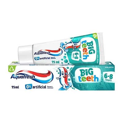 Aquafresh Big Teeth Toothpaste is specially formulated for children aged 6-8 years, designed by dental experts to provide essential care for mixed teeth, which include both milk teeth and adult teeth. This toothpaste uses a low-abrasive formula that ensures gentle cleaning, making it perfect for young, sensitive teeth.