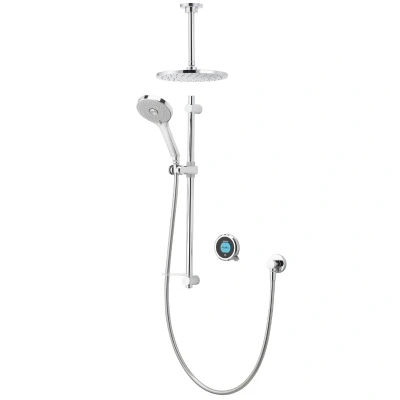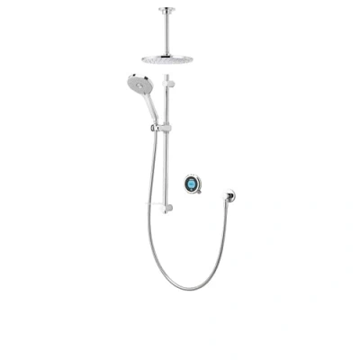 Aqualisa Optic Q Smart Shower Concealed with Adj and Ceiling Fixed Head - Gravity Pumped (OPQ.A2.BV.DVFC.23). Optic Q Smart is now fitted with the new and improved Aqualisa SmartValve™ with an integrated diverter that delivers the most personalised showering systems available in terms of performance selection, safe, regulated temperature control and eco-friendly water usage. This is a flexible dual outlet system combining a ceiling-fixed overhead shower with an adjustable height handset and rail, ideal for different types of showering. Behind an attractive, illuminated control screen, a single cable easily connects to the intelligent SmartValve™, which can be placed in the most accessible location 7.5 metres away from the shower area. With Wifi connection, the selected shower profile (pre-set or individually created) can be managed on a smart phone using the Aqualisa app or voice control with data available to check water usage and indicative costs. Suitable for approved low pressure water systems only. Optional eco mode on the SmartValve™ which can be selected for water saving up to 33% (water system dependant). Wifi, Mobile App, Google Home and Amazon Alexa enabled to allow you to control your showers remotely. Safe and satisfactory thermostatic showering with adjustable maximum temperature. Glide temperature control for simplistic use. Auto wake up' when you approach the controller. Timer feature allows you to set your shower duration. 130mm Vita handset with 3 spray patterns and 250mm round drencher. Optional wireless remote. Genuine brand new Aqualisa product, covered by a Aqualisa manufacturer's guarantee.