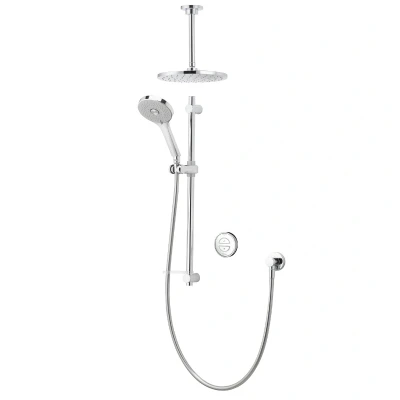 National Shower SparesAqualisa Unity Q Smart Shower Concealed with Adj and Ceiling Fixed Head - HP/Combi (UTQ.A1.BV.DVFC.23). Unity Q Smart is now fitted with the new and improved Aqualisa SmartValve™ with an integrated diverter that delivers the most advanced showering systems available in terms of performance selection, safe, regulated temperature control and eco-friendly water usage. This is a flexible dual outlet system combining a ceiling-fixed overhead shower with an adjustable height handset and rail, ideal for different types of showering. Behind the push button control and temperature ready display, a single cable easily connects to the intelligent SmartValve™, which can be placed in the most accessible location 7.5 metres away from the shower area. With Wifi connection, showering choices can be managed from a smart phone using the Aqualisa app or voice control with online data available showing water usage and indicative costs. Suitable for approved high pressure water systems only. Thermostatically controlled showering with push button one start control. LED display to let you know your chosen temperature has been reached. Wifi, Mobile App, Google Home and Amazon Alexa enabled to allow you to control your showers remotely. Mutliple showers can be controlled from 1 app. 130mm Vita handset with 3 spray patterns and 250mm round drencher. Compatible with wired remote control. Optional eco mode on the SmartValve™ which can be selected for water saving up to 33% (water system dependant). Genuine brand new Aqualisa product, covered by a Aqualisa manufacturer's guarantee.