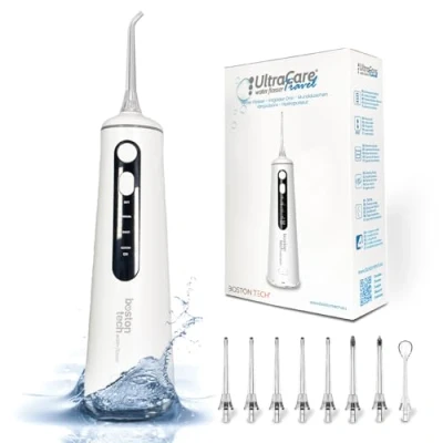 🇪🇺 LEADING EUROPEAN BRAND IN DENTAL CARE: Boston Tech, the manufacturer of UltraCare Travel, is a recognised European brand recommended by dentists and renowned for its high quality worldwide. Enjoy 3 years of warranty and official technical support in Europe. ♻️ SUSTAINABLE AND ECO-FRIENDLY COMPANY: Committed to the environment, UltraCare Travel adopts responsible and eco-conscious consumption practices. 🦷 REMOVES UP TO 99.9% OF DENTAL PLAQUE: Thanks to its advanced pressure technology, designed by dentists and engineers, accumulated plaque is effectively removed, improving oral health. 💨 GENTLE AND DEEP CARE: Its patented pressure pump is adapted to the oral anatomy, causing no damage to gums, implants, braces, or teeth, providing thorough and safe cleaning. 🔢 4 ADJUSTABLE USAGE MODES: Customise your cleaning routine with 4 modes (Soft, Normal, Pulse, and Customisable) to suit your needs and preferences, from gentle to more intense cleaning. 🌐 CERTIFIED QUALITY: UltraCare Travel meets the highest international quality and safety standards, ensuring efficiency and reliability. 🪥 8 SPECIALISED NOZZLES FOR THE WHOLE FAMILY: Includes 8 different nozzles designed for daily cleaning, orthodontic care, bacterial plaque removal, tongue cleaning, and more, offering specific solutions for every need. 📏 300 ML TANK: Its compact capacity allows effective cleaning without the need for constant refilling, optimising your daily routine. 🏆 DURABLE AND LONG-LASTING MATERIALS: Made with high-quality materials that ensure a long lifespan, withstanding daily use without losing effectiveness. 🚫 AVOID IMITATIONS: The dental water flossers manufactured by Boston Tech are 100% original and unique in the market, with a multilingual instruction manual, including English, for safe and effective use.
