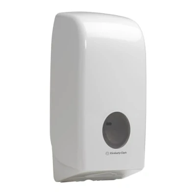 One white Aquarius folded toilet paper dispenser Effective single sheet dispensing means each toilet tissue sheet is only touched by the user reducing cross contamination and waste Jamming, wastage and costs are minimised by the unique, patented overfilling device of this toilet paper dispenser which ensures a smooth dispensing experience The sleek and smooth rounded design of this toilet paper dispenser has no dirt traps, allowing an easy one-wipe-clean for improved washroom hygiene Compatible with a variety of Kimberly-Clark folded toilet paper products