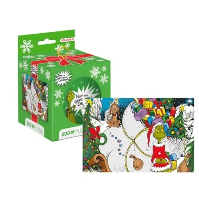 GRINCH CHRISTMAS 300 PIECE JIGSAW PUZZLE IN A 3.25" TIN GLOBE: Enjoy piecing together this 300 piece puzzle measuring 8" x 6" and featuring classic imagery from the book How the Grinch Stole Christmas. As if that's not enough, it comes is a festive 3.25" tin globe that fans will love LOOKING FOR DR SEUSS GRINCH GIFTS? This sweet 300 pc puzzle comes in a decorative holiday tin shaped like a ball. It's the ultimate gift for fans of all ages. Perfect for family puzzling, game night, birthdays and especially Holidays, kids and adults will absolutely love receiving it PREMIUM QUALITY YOU CAN TRUST: Our precision cutting technique ensures a perfect fit of all puzzle pieces, leaving virtually no puzzle dust behind. We use thick quality paper that is glare-free so you can show off your masterpiece with pride 100% OFFICIALLY LICENSED DR SEUSS MERCHANDISE: All our Grinch puzzles are designed by AQUARIUS, officially licensed and 100% authentic. They're the perfect piece of How the Grinch Stole Christmas collectible memorabilia to add to your collection THE AQUARIUS PROMISE: It's simple. We stand behind our products 100% and if you're not completely satisfied with your purchase, we'll offer you a full refund! Click the "Add to Cart" button today and buy with confidence, Manufacturer: AQUARIUS