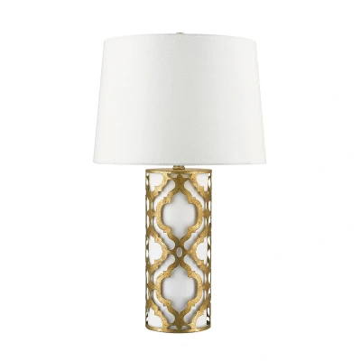This stunning table lamp features a beautiful distressed gold outer shade adorned with an intricate cut-out pattern design. The elegant look is complemented by an inner fitting consisting of cream linen fabric shades paired with glass diffusers. This thoughtful combination serves a dual purpose: it not only enhances the lamp's aesthetic appeal but also works effectively to soften the light, creating a warm and inviting atmosphere in any room.