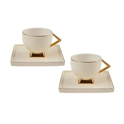 4-Piece Coffee Cup Set: This coffee cup set consists of 2 white porcelain cups paired with matching saucers. Each cup has a rounded shape, adorned with intricate patterns and gold accents on the rim and handle. Versatile Cup Set: The coffee set is ideal for serving Turkish coffee, Armenian Coffee, Arabic Coffee, or espresso, making it suitable for hot beverages. Its clean white porcelain look, combined with the shiny gold accents, is suitable for everyday use and special occasions. Quality Material: Crafted with care, these cups are made of porcelain, ensuring their durability and timeless beauty. Ideal for impressing guests or adding a dash of elegance to your daily routine, these cups are as stylish as they are practical. Timeless Gift: Our Turkish coffee cups feature a sleek and modern design with gold-colored handles and a square-shaped saucer, adding a touch of elegance and sophistication; making it the ideal gift for new homeowners, newlyweds, a Mother’s Day, or any of your loved ones. Care Instructions: We recommend hand washing to preserve their elegance, ensuring the delicate details and beautiful finish remain pristine for years to come.