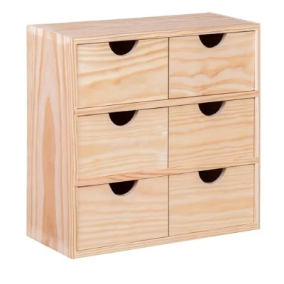 The 6 Drawer Mini Lock is a small wooden chest of drawers, ideal for organising small items or stationery. It has a compact design, making it perfect for tight spaces. Its measurements are 32 x 14 x 32 cm It comes in a natural finish that fits into any environment. This drawer offers enough space for small desk items or personal items, making it a functional and decorative addition.
