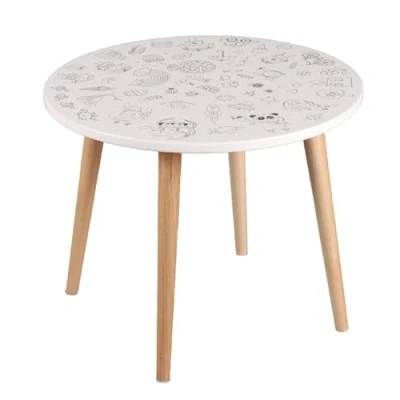 Table 'Paint' with drawings and pine legs. It is a children's table that can be colored over and over again. This table, with a quick wipe with a sponge will be ready. You can color several children at once. Round format with pine legs. Dimensions: 50 x 50 x 40 cm