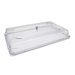 82(H) x 325(W) x 530(D)mm. Plastic. Clear. BPA free. Reusable and recyclable. Lid clips on to the tray for secure transportation. Highly durable design. Dishwasher safe. Suitable for use in commercial freezers to -40°C. Food safe.