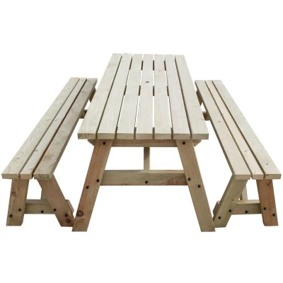 General description At Arbor Garden Solutions, we champion wooden outdoor furniture as an affordable and sustainable way to enhance your outdoor space. Our 6ft (180cm) picnic table and bench set, featuring a natural light-green finish and Victoria square corners, is designed for both relaxation and functionality. Each bench is supplied in knockdown form for easy on-site assembly, allowing for convenient access to your desired location. Technical specifications Table Height: 730mm Table Width: 700mm Bench Height: 465mm Bench Width: 265mm Material: Heavy-duty pressure treated timber (89mm x 38mm / 4 x 2) Available finishes: Rustic brown and light green (natural) All visible bolts have black cover caps for safety and aesthetics Corrosion-resistant fixings Timber sourced from responsibly managed forests Installation Easy to assemble, the picnic table and bench set requires only a socket set and screwdriver (preferably battery-operated). Assembly instructions will be included with the