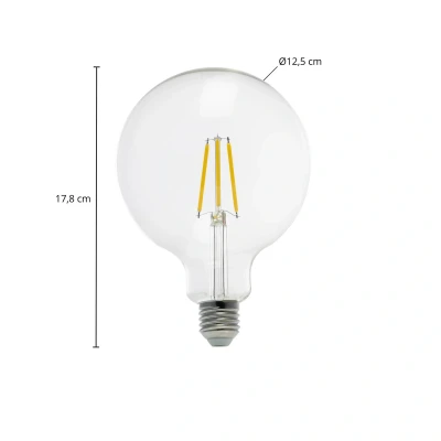 Lights.coG125 filament LED bulb E27 3.8 W 2,700 K, EEC A This filament LED bulb has G125 globe dimensions and is therefore larger than normal bulbs. This makes it particularly suitable for open luminaires, which can then be complemented with a bulb that matches their appearance. The bulb has a particularly good energy efficiency rating of A and therefore consumes very little electricity in relation to its light output. Technical data: - Warm white (2,700 Kelvin) - Globe shape G125 - EEC A