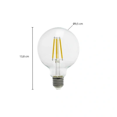 Lights.coLED filament globe bulb G95 E27 3.8W 2700 K, energy efficiency class A This globe bulb with a filament look is well suited for use in open luminaires, as this LED globe bulb in globe form with a clear glass surface really comes into its own. It scores points with its pleasant warm white light colour (2,700 Kelvin) and excellent energy efficiency class A, meaning that relatively bright light is achieved with low consumption. Technical data: - Warm white (2,700 K) - Excellent energy efficiency class A - Globe bulb G95