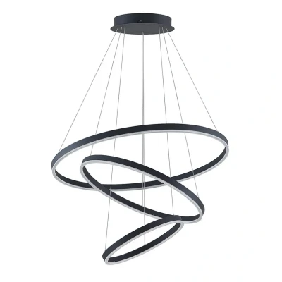 ManoManoGeneral description This LED Ceiling Light 'Albiona' features a stylish industrial design, making it a perfect addition to your living room, dining room, kitchen, hallway, or office. With its modern aesthetic, it enhances the ambiance of any space, adding a charming touch to your home or workplace. The pendant light consists of three aluminum rings of different sizes, suspended at an angle, and is designed to provide excellent ambient lighting. Technical specifications Type: LED pendant light Material: Metal (aluminum) Dimensions: Ø 80 cm Light source: Warm white LED bulbs (included) Number of bulbs: 3 Installation Ready to use: Lightbulb included for easy assembly. Usage Easily dimmable: Adjust the light intensity with an extra dimmer switch (not included). Ideal for creating a cozy and warm atmosphere in your home. Other information