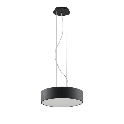 Black LED pendant light Noabelle in cylindrical shape, selectable light colour Noabelle is a simple light source with a modern, minimalist look. The pendant light consists of a black, cylindrical metal shade and a white acrylic cover on the underside. This acts as a diffuser, allowing for particularly uniform light. The LED pendant light is suitable for private use, but commercial use of the pendant light is also conceivable. If you cannot decide on a purpose in advance, it is an advantage that you can set the light colour via a DIP switch during installation. Warm white light emphasises the cosiness of the room, while a colour temperature in the cool white range is better suited to concentrated work. The suspension system has a filigree design and consists of barely visible wire cables for a particularly light, floating effect. Thanks to the LEDs, bright light can be guaranteed with rather low power consumption, as the efficiency of the light is good.