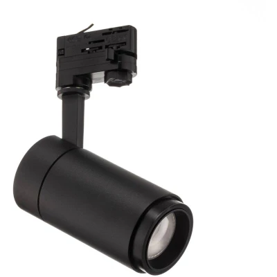 Black LED track spotlight Nanna - adjustable beam angle, for three-circuit track, rotatable and swivelling This track spotlight is compatible with common three-circuit track systems and can be used both privately and commercially. The cylindrical-shaped LED lampshade has an aluminium housing in black and an internal lens whose light beam angle can be changed from 15°, which is rather narrow and pinpoint to create spot-shaped light, to 60°, which corresponds to a wider light emission to illuminate a slightly larger area. There are small markings on the spotlight for correctly setting an angle and the spotlight is very suitable for professional illumination of commercial spaces, with the variable adjustment options allowing a precisely tailored lighting situation to be created, especially as the spotlight itself can also be rotated and swivelled. In addition to good efficiency and a long service life and the adjustable setting options, the LED track spotlight Nanna is also a light source that scores with very good colour rendering, as the CRI value here is over 90, so that the colours in the room can be displayed as faithfully as possible, even if no daylight is available.