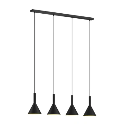 Lights.coBlack Tadej pendant light in beam shape with four funnel-shaped metal lampshades Tadej is a light source that immediately impresses with its modern overall effect and can be beautifully integrated into design-oriented, purist interiors. The lampshades are funnel-shaped, widen towards the bottom and score points with a colour combination of black exterior finish and white interior. The metal serves as a beautiful reflector and the light is directed onto the table or counter surface to be illuminated by the hanging light. As E27 is a universal socket, there are countless different light bulbs available today that can be used.