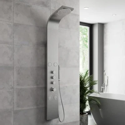 Architeckt® Thermostatic Shower Tower Column Panel, Three Function 3 in1 System with Rainfall Head Handset 4 Body Jets Showers Curved, Brushed Steel