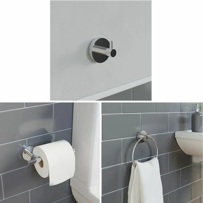 General description This bathroom accessory is part of the Venus range of bathroom fittings, designed to provide a modern yet minimalist feel to your bathroom. The set includes a robe hook, towel ring, and toilet roll holder, all crafted with cylindrical wall fixings and rounded edges for a contemporary look. Technical specifications Finish: Chrome Material: Zinc Alloy Mounting: Wall Mounted Installation Designed with simplicity in mind for easy installation. Includes wall fixings that are concealed once fitted. Optional adhesive available for installation without drilling holes in tiles. Usage Perfect for modern bathrooms, complementing contemporary sanitaryware. Ideal for use with freestanding or shower baths.