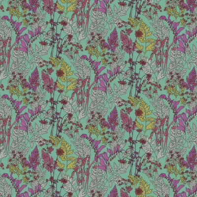 Walk through a peaceful field of country flowers, featuring tall, delicate stems and bright floral blooms. Seen here in the Aqua colourway.