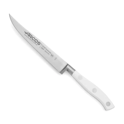 The Riviera Series 130 mm Steak Knife, manufactured by Arcos, offers you the best experience for slicing any type of meat, without exerting much force; With this slicing knife you can make extremely precise cuts for slicing roast meat; It is designed with high quality materials and state-of-the-art technology Arcos to guarantee a practical and safe use; Our company has been in the cutlery business since 1734 PRECISION AND DURABILITY: This steak knife is made using a stainless steel patented technique by Arcos called Nitrum, which provides increased durability, hardness, and high precision cutting; The Riviera Blanc series knives are characterized by the rounded French-style ferrule and for its bolster, which provides safety as well as style SAFETY AND DESIGN: The handle is made of polyoxymethylene (POM) so it is highly resistant to detergents and extreme temperature; It can be cleaned using chemicals and is suitable for the dishwasher; Lastly, this knife is made with stainless steel rivets to ensure a better grip DIMENSIONS: This steak knife measures 230 mm in length and weighs 140 grams; Size Blade: 130 mm | 5” Inch making it a great tool for all your kitchen cutting needs ARCOS: A family-owned business with a legacy of craftsmanship dating back to 1734; Almost three centuries of research and continuous improvement of our products make Arcos an international benchmark in the cutlery sector; From Albacete, Spain, we produce 11,000,000 knives every year that combine knowledge, design and innovation in order to achieve the highest quality standards; We distribute our unique pieces in over 70 countries around the world