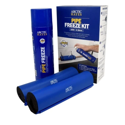 General description The Arctic Hayes ZEK2 8-28mm Large Aero Disposable Freeze Spray Kit is a safe and professional solution for extending or repairing pipework quickly, without the need to drain the entire system. Ideal for small DIY or domestic plumbing tasks, this kit allows you to freeze pipes in as little as 2 minutes, facilitating repairs or installations. Technical specifications Capacity: 300ml aerosol Freezing temperature: down to -50°C Suitable for freezing pipes with diameters of 8-15mm (per section) or 22-28mm (single freeze) Compatible with various pipe materials including copper, steel, lead, iron, plastic, and stainless steel Non-flammable formula with low global warming potential Compatibility and accessories Compatible with copper, steel, lead, iron, and plastic pipes Includes: 1 x 300ml aerosol pipe freezer and 2 x freezing jackets Installation Attach the freezing jackets around the pipe section to be frozen Spray the aerosol into the jackets to create a freezing