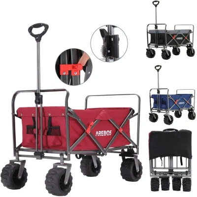 General description The AREBOS Foldable Hand Truck is a versatile and practical utility trolley designed for various outdoor activities such as camping, shopping, and festivals. With a maximum load capacity of up to 100 kg, this folding wagon is perfect for transporting items with ease. Its compact design allows for convenient storage in small spaces, making it an ideal choice for those on the go. Technical specifications Maximum load capacity: 100 kg Dimensions (loading area): 78.6 x 44.5 x 25.5 cm Dimensions (folded): 78 x 52 x 18 cm Overall dimensions (L x B x H): 89 x 52 x 80 cm Weight: 11 kg Material: 600D Oxford fabric Compatibility and accessories Includes 2 integrated storage nets for additional storage of cups, tins, and bottles Comes with a carrying bag for easy transport and storage Installation Quick assembly and folding in just a few steps Usage Ideal for camping, shopping, barbecues, and outdoor activities Can be used for transporting items during festivals or family