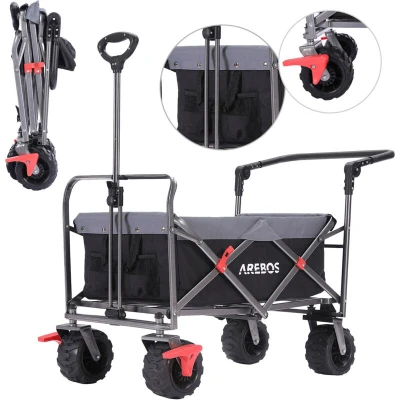 General description The AREBOS Handcart Transport Cart is a versatile and practical solution for all your transport needs. Ideal for camping, shopping, or outdoor activities, this foldable utility wagon features a telescopic push bar and offers ample space for excursions and leisure activities. Its compact design allows for easy storage in small spaces, making it a convenient addition to your outdoor gear. Technical specifications Maximum load: 100 kg Dimensions (loading area): 72 x 45.6 x 27 cm Dimensions (folded): 80 x 56 x 21.4 cm Dimensions (L x B x H): 92 x 62.5 x 80 cm Weight: 13 kg Material: 600D Oxford fabric Compatibility and accessories Includes 2 integrated storage nets for additional storage Comes with a carrying bag for easy transport and storage Installation The handcart can be quickly assembled and folded in just a few steps, allowing for hassle-free setup and storage. Usage This utility wagon is perfect for various activities such as: Camping Barbecue parties Shopping