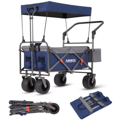 General description The AREBOS Luxury Outdoor Utility Wagon is a versatile and stylish transport solution designed for various outdoor activities. With its spacious loading area and additional storage options, this foldable handcart is perfect for family outings, gardening, festivals, and more. The removable roof provides reliable protection from sun and rain, making it an ideal companion for all seasons. Technical specifications Max. Load capacity: 100 kg Capacity: approx. 90 litres Dimensions (LxWxH): 87 x 63 x 106 cm Dimensions (folded format): 76 x 63 x 22 cm Internal dimensions: 75 x 45 x 27 cm Storage bag size: 46 x 18 x 17 cm Storage bag capacity: 14 litres Size of the wheels: Ø 18 cm x 10 cm Material of the wheels: PU, plastic Material: 600D Oxford fabric Frame material: Tubular iron Front wheels rotate 360°: Yes Rear wheels with brake: Yes Weight: 14.5 kg Colour: Blue/grey Brand: AREBOS Scope of delivery: 1x luxury handcart, 1x roof, 4x roof rack, 1x instruction manual