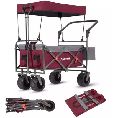 General description The AREBOS Luxury Outdoor Utility Wagon is a versatile and stylish transport solution designed for various outdoor activities. This foldable handcart features a spacious loading area, an integrated sun canopy, and a robust construction, making it ideal for family outings, gardening, festivals, and more. With its high-quality materials and thoughtful design, it combines functionality with aesthetic appeal. Technical specifications Max. Load capacity: 100 kg Capacity: approx. 90 litres Dimensions (LxWxH): 87 x 63 x 106 cm Dimensions (folded format): 76 x 63 x 22 cm Internal dimensions: 75 x 45 x 27 cm Storage bag size: 46 x 18 x 17 cm Storage bag capacity: 14 litres Size of the wheels: Ø 18 cm x 10 cm Material of the wheels: PU, plastic Material: 600D Oxford fabric Frame material: Tubular iron Front wheels rotate 360°: Yes Rear wheels with brake: Yes Weight: 14.5 kg Colour: Red/grey Brand: AREBOS Scope of delivery: 1x luxury handcart, 1x roof, 4x roof rack, 1x