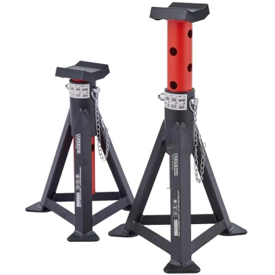 General description The AREBOS jack stands set includes two robust and stable trestles designed for safe work under vehicles in workshops and garages. With a total load capacity of 6000 kg per pair and a maximum load capacity of 3 tonnes per trestle, these stands are ideal for various maintenance tasks such as underbody repairs, exhaust repairs, and oil changes. The height is easily adjustable from 295 mm to 442 mm, ensuring flexibility for different vehicles. Technical specifications Load capacity: 3000 kg (single) Max. lifting height: approx. 442 mm Min. height: approx. 295 mm Lifting range: 143 mm Dimensions (LxWxH): 254 x 223 x 295-442 mm Saddle dimensions: 75 x 60 mm Rubber pad dimensions: 85.3 x 68 x 25.1 mm Material: Steel, rubber Total weight: Approx. 5.6 kg Colour: Black / Red Scope of delivery: 2x Trestle, 2x Rubber pad, 1x Instruction manual Usage The AREBOS jack stands are suitable for both professional and private users. They provide reliable support when changing wheels
