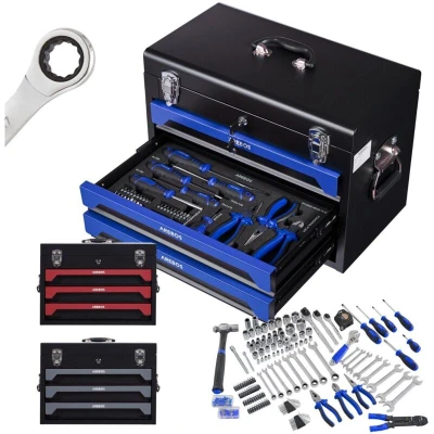 Arebos Tool Box Including 172 Piece Set Chrome Vanadium Socket Spanner Hand Tools for Home, Garage & Workshop Equipped with 3 Drawers Lockable Blue/Black