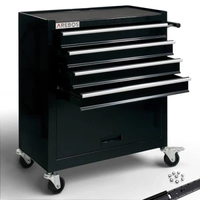 Arebos Tool cabinet cart workshop trolley on wheels portable Black 4 drawes + 1 compartment for tools incl. anti slip mats drawers with ball bearings