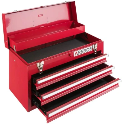 ManoManoGeneral description The AREBOS Tool Box is a versatile storage solution designed for both professionals and DIY enthusiasts. Featuring three spacious drawers, a hinged compartment, and an additional storage compartment in the lid, this tool case allows for organized storage of a wide range of tools and accessories, ensuring everything you need is always within reach. Constructed from robust, powder-coated steel, it offers high durability and protection against the daily challenges faced in workshops and construction sites. Technical specifications Dimensions of drawers: 45 x 19 x 4 cm Dimensions of hinged compartment: 50 x 20.5 x 6 cm Dimensions of additional storage compartment in the lid: 49 x 11.5 x 5 cm Overall dimensions of tool case: 52 x 22 x 30.5 cm Surface: scratch-resistant, powder-coated Weight: approx. 8.2 kg Color: black Includes: 1x tool case, 1x instruction manual Compatibility and accessories Can be combined with AREBOS workshop trolleys as an attachable tool box